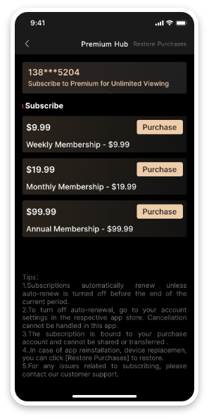The membership activation process is very simple, please follow the steps below: 1. Ensure that you have logged into your account. 2. Go to the Member Center page: Method 1: Click the 'Activate' button on the 'My' page. Method 2: When you unlock a paid episode while watching, the system will guide you to the membership activation page. 3. Choose the membership packages we offer you with different periods and prices (e.g. weekly, monthly, annual). 4. The system will redirect to your device's app store (Apple App Store or Google Play Store) to complete the payment. 5. After successful payment, you will immediately see a prompt of "activation successful", and the membership privileges will take effect immediately!